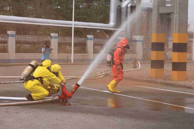 由于氯氣是具有刺激性氣味的有毒氣體,可以溶解于水,因此應急處理主要是通過噴灑形成水霧的方法來降低氯氣濃度,控制擴散范圍?,F(xiàn)場用紅色煙霧代替黃綠色氯氣。演練中,市安監(jiān)、公安、消防、環(huán)保、質監(jiān)、衛(wèi)生、氣象等部門積極聯(lián)動,各司其職,氣象部門提供風力、溫度、濕度等實時數(shù)據(jù),環(huán)保部門負責空氣中氯氣含量檢測,公安負責交通管制和疏散救援……僅用了不到40分鐘即圓滿完成了泄漏源堵漏和周邊企業(yè)及居民的疏散工作,充分展示并檢驗了市政府、職能部門及企業(yè)應對危險化學品事故的應急處置能力。