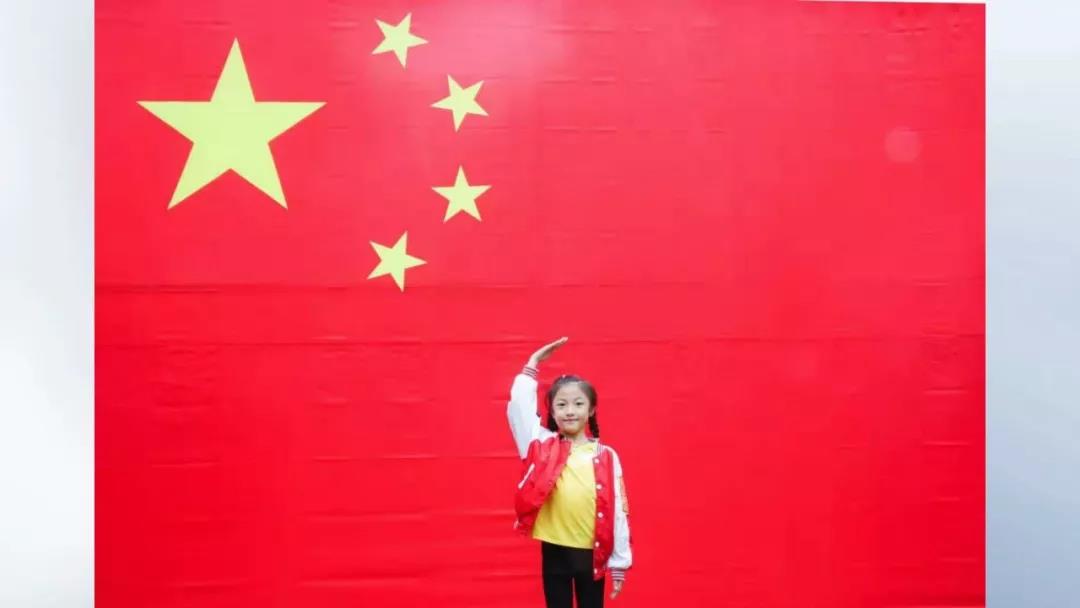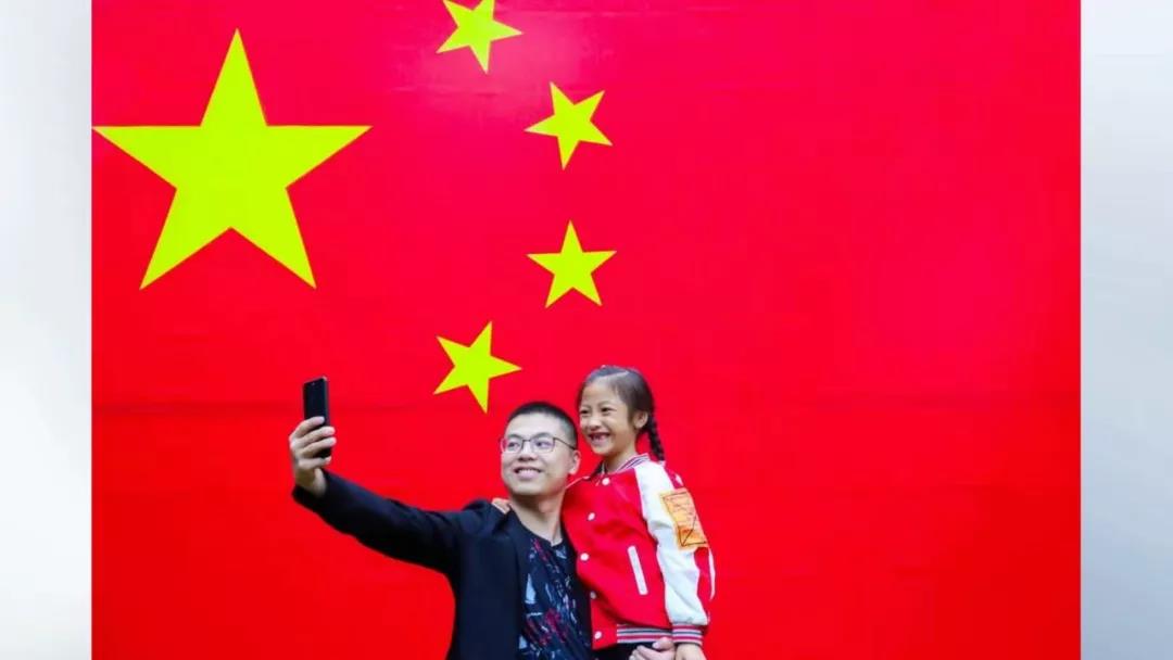 在水繪園風(fēng)景區(qū),他們看到了一幅巨大的五星紅旗。周啟明拿出手機(jī),拍下自己和女兒與國旗合影的畫面,讓孩子接受愛國主義教育。這時,正好碰上了攝影師徐慧,拍下了這幅幸福溫馨的照片。