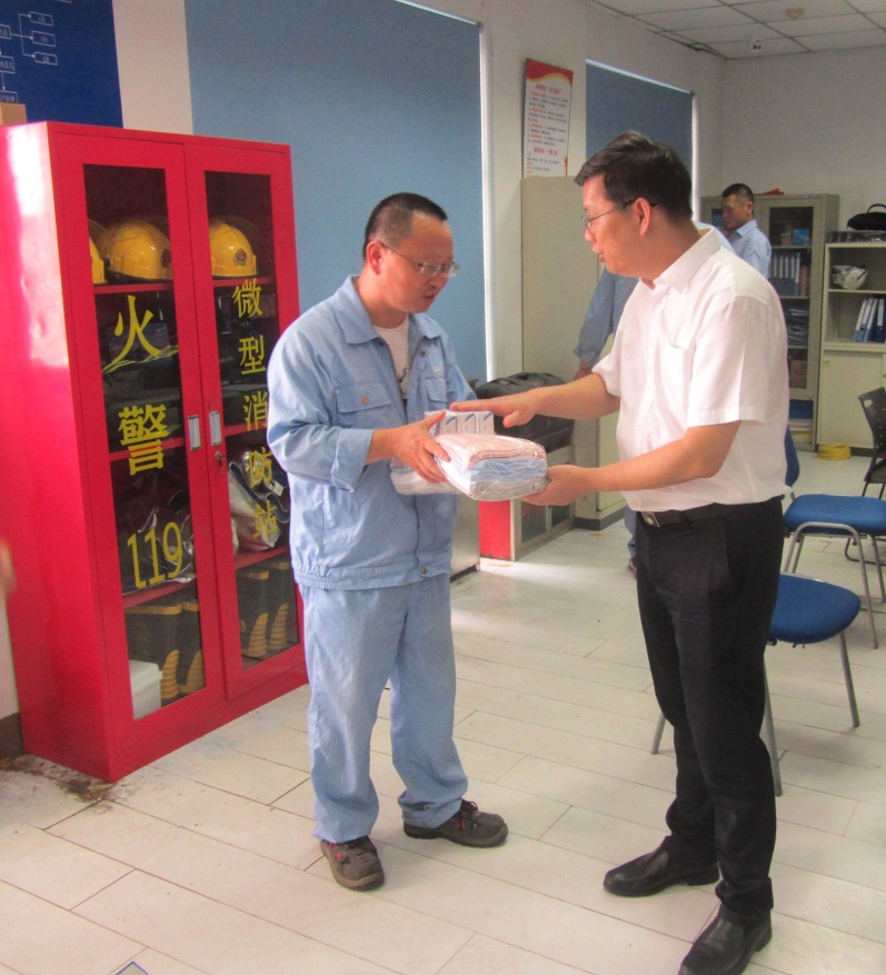 近日持續(xù)高溫, 8月18日下午,產(chǎn)控集團(tuán)董事長張劍橋前往江山農(nóng)化、江天化學(xué)、醋酸化工等企業(yè)慰問堅(jiān)守生產(chǎn)崗位的一線職工,送去毛巾、藿香正氣液、仁丹、風(fēng)油精等防暑降溫物資。