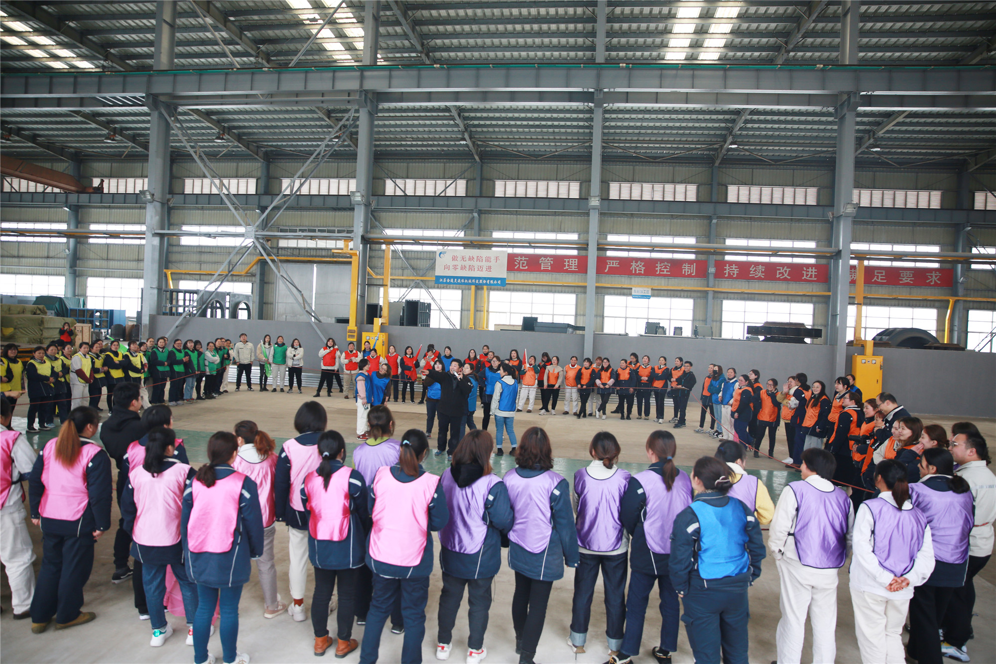 3月8日下午, 一百多名女職工歡聚2號車間,在教練的帶領(lǐng)下,分成了10個小組,按照要求分別設(shè)計了自己隊的隊名、隊徽、口號、隊歌,并依次展示了團隊風(fēng)采。在充滿樂趣的熱身小游戲后,便開始了“坦克大戰(zhàn)”、“環(huán)游世界球”、“動力繩圈”等團隊拓展項目。在彼此信任、相互溝通、集體協(xié)作的氛圍中,各小組成功完成了此次拓展任務(wù)。參加此次活動的廣大女職工們有長期伏案的科員,有奮戰(zhàn)一線的工人,也有集團中高層領(lǐng)導(dǎo),在新組建的團隊中,大家拋開身份,融入隊伍,在隊長的帶領(lǐng)下,克服困難,團結(jié)一心,共同為隊伍加分增光。