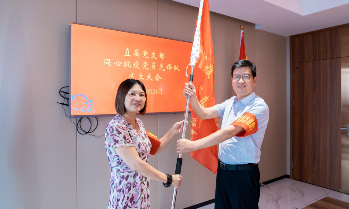 活動上,張建新宣讀了產(chǎn)控集團黨委《關(guān)于開展“兩在兩同 同心抗疫”志愿服務活動的通知》內(nèi)容并宣布了“同心抗疫”黨員先鋒隊正式成立。集團黨委副書記曹燕紅代表集團黨委向直屬黨支部授予“同心抗疫黨員先鋒隊”隊旗,并向每一位先鋒隊員發(fā)放了“黨員志愿服務”紅袖套。隨后,張建新帶領(lǐng)全體黨員先鋒隊員面對黨旗、高舉右手,重溫了入黨誓詞。