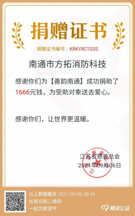 為弘揚(yáng)中華民族扶貧濟(jì)困優(yōu)良傳統(tǒng),積極奉獻(xiàn)愛心,按照市民政局等單位《2021年“博愛在南通 慈善暖江?!币蝗站杌顒?dòng)方案》的通知要求,方拓消防于9月1日組織開展了線上一日捐活動(dòng)。