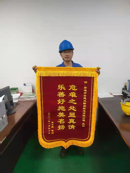 涓涓熱血,匯注生命希望,點(diǎn)滴真情,架起愛的橋梁。9月6日上午,金通靈精密制造有限公司迎來(lái)了一位特殊的客人——施先生,將一面寫著“危難之處顯真情,樂(lè)善好施美名揚(yáng)”的錦旗送到我司三車間員工王棟手中,感謝他在緊急關(guān)頭無(wú)償獻(xiàn)血,幫助施先生的家庭重獲希望。