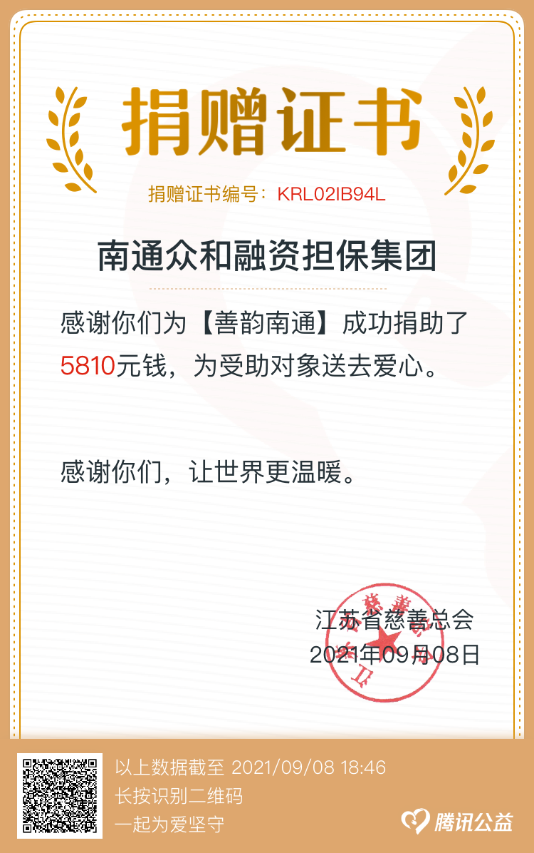 為進一步弘揚中華民族扶貧濟困傳統(tǒng)美德,倡導(dǎo)“以人為本,樂于奉獻”的互助精神,眾和擔(dān)保積極發(fā)動發(fā)動、廣泛宣傳,第一時間組織全體干部職工開展“慈善一日捐”活動。公司領(lǐng)導(dǎo)班子成員率先垂范,帶頭捐款,全體干部職工踴躍參與,奉獻愛心,參與度100%9月8日,共籌得善款5810元,募集資金將統(tǒng)一交至南通市慈善總會,用于扶貧、慈善救助項目。