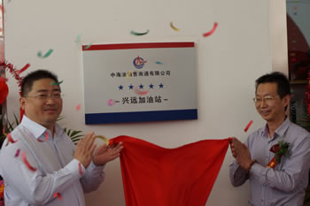 中海油銷(xiāo)售江蘇有限公司副總經(jīng)理陳東昱和南通產(chǎn)業(yè)控股有限公司集團(tuán)副總經(jīng)理沈百安為興遠(yuǎn)加油站揭牌